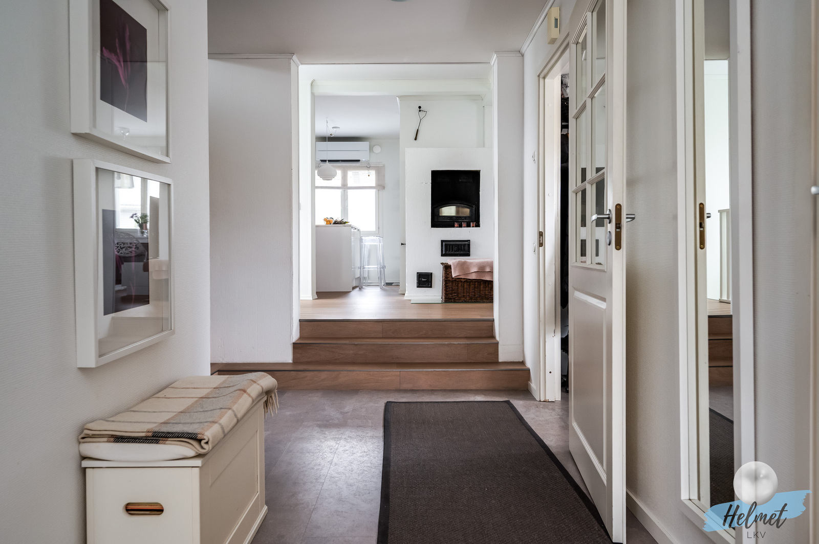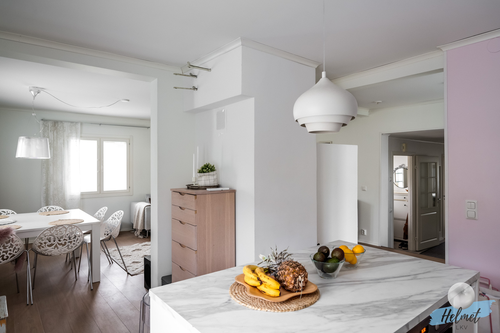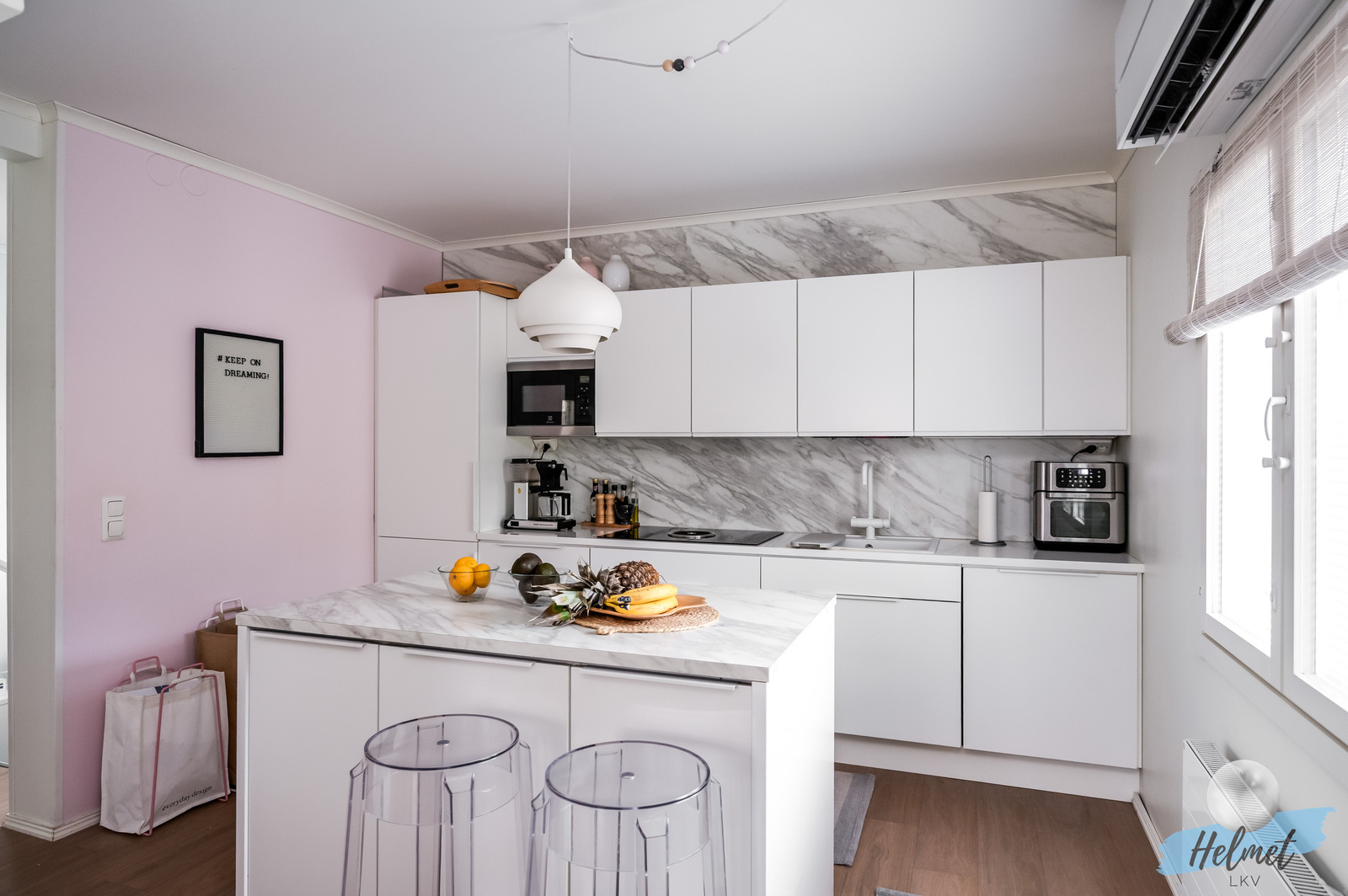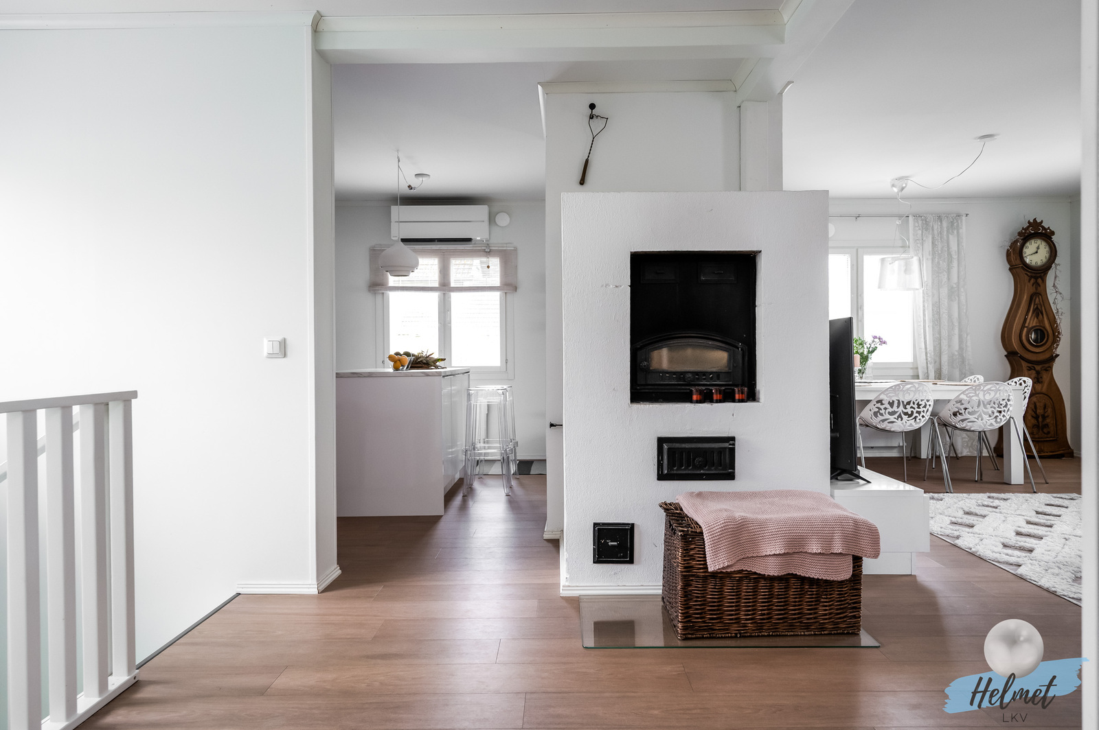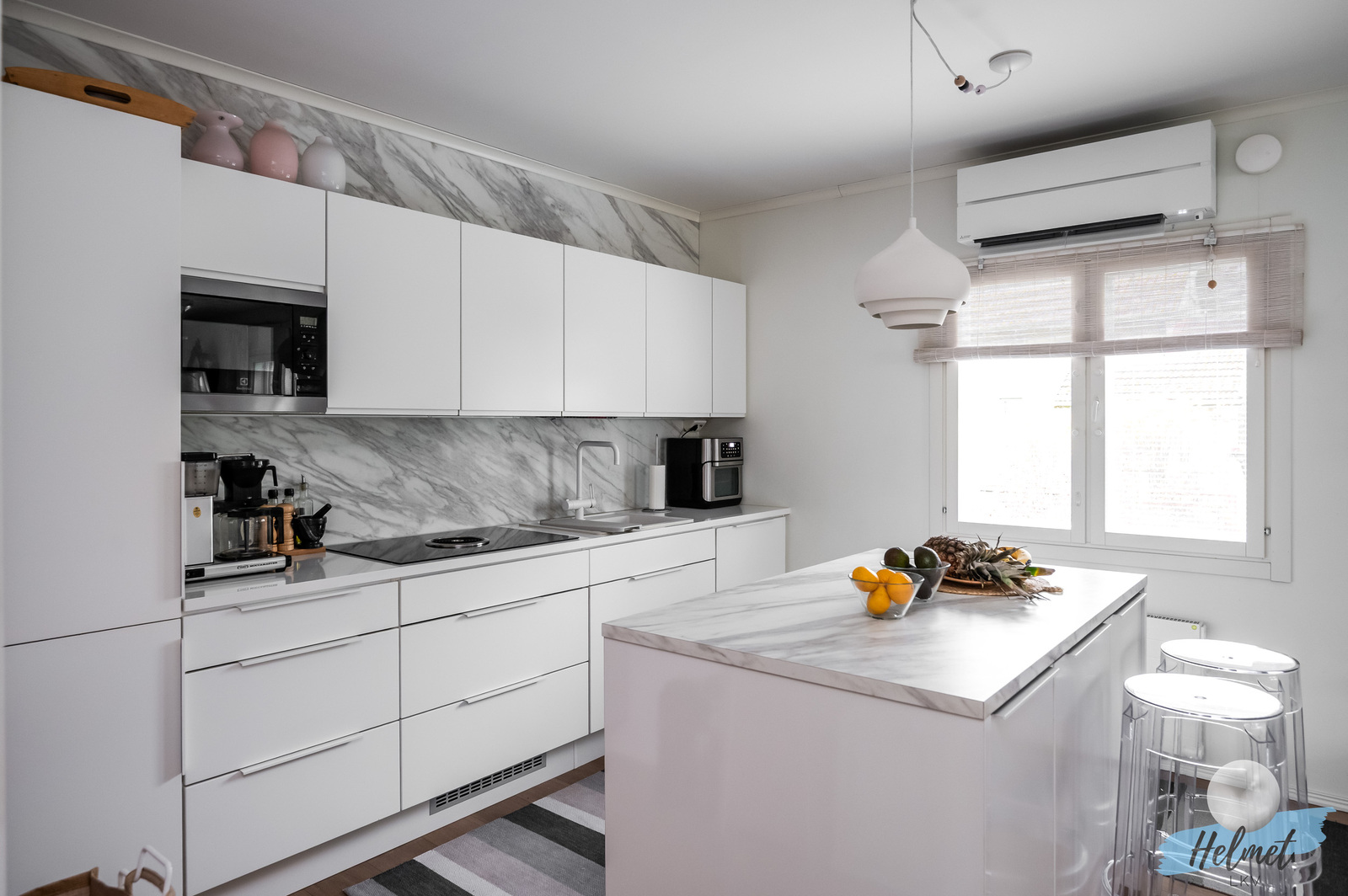 Keittiö uusittu ja avarrettu olohuoneeseen 2018. Tämä remontti on tehty ”pintaa syvemmälle”.