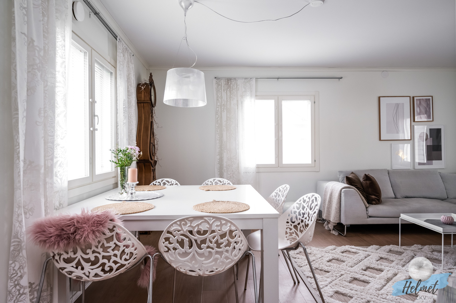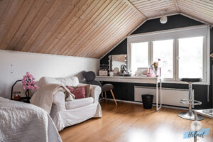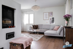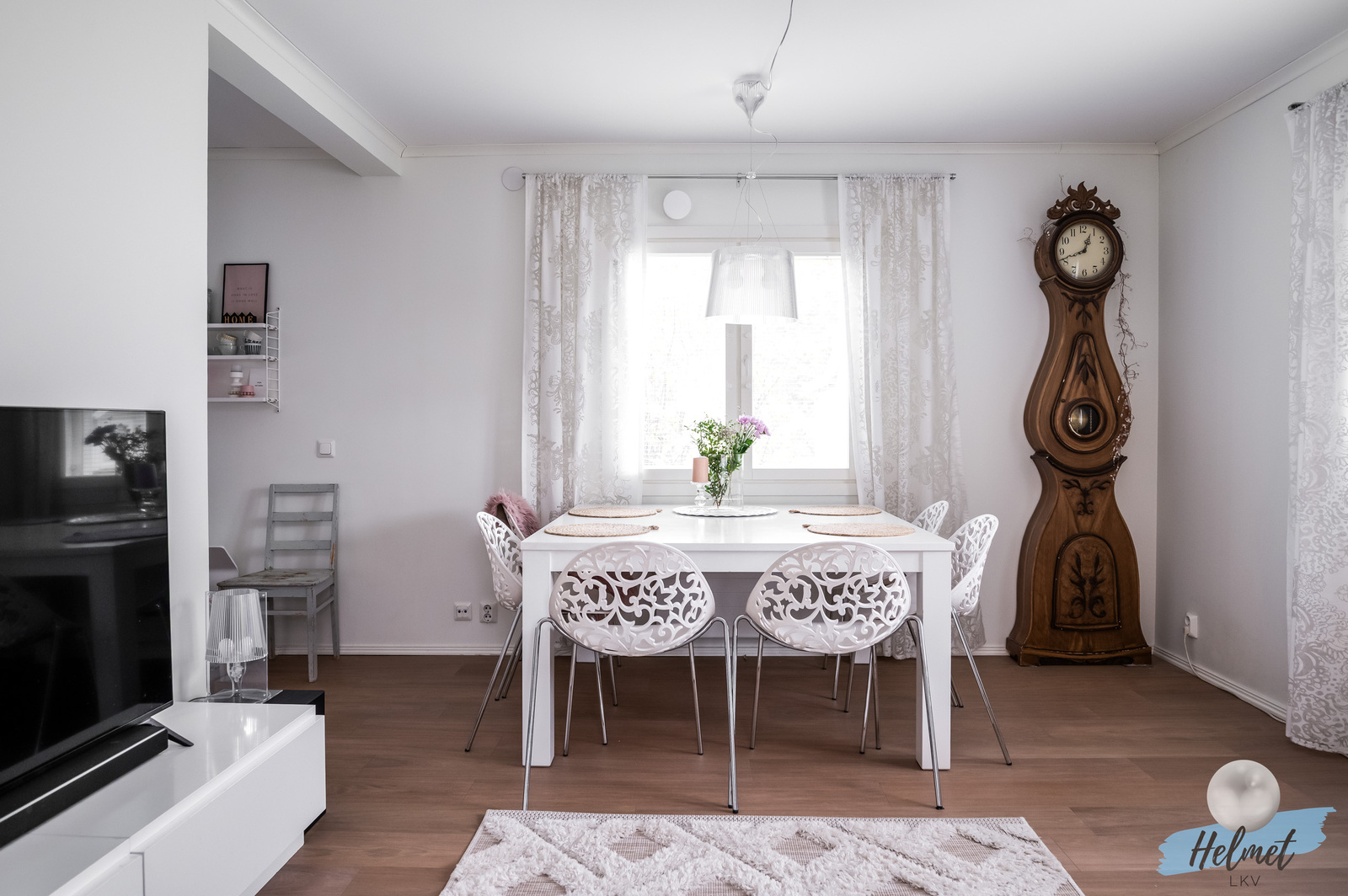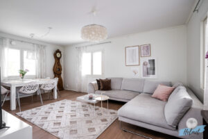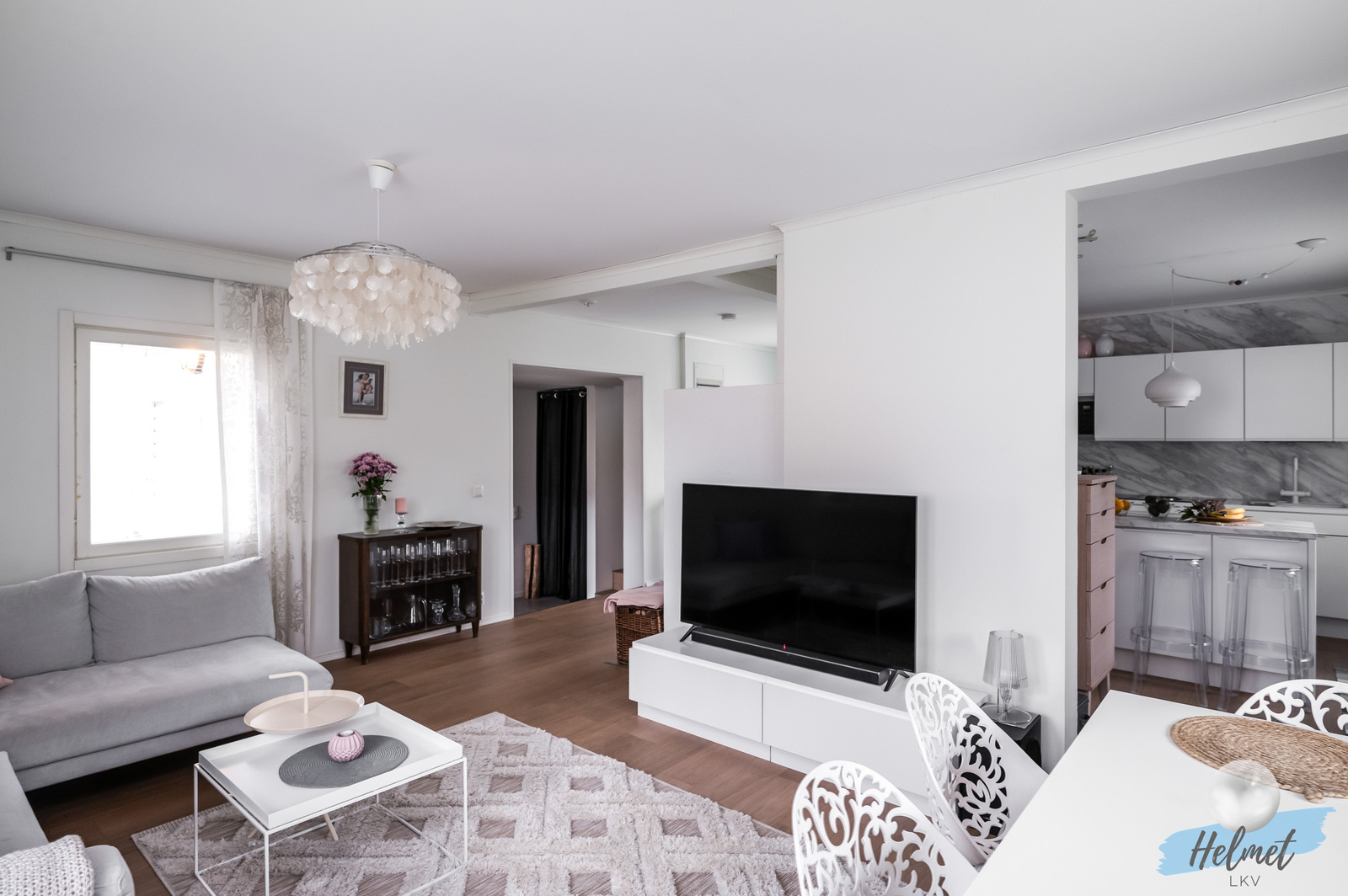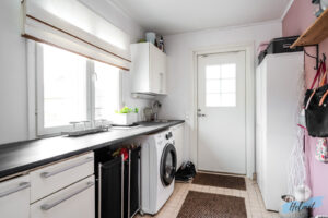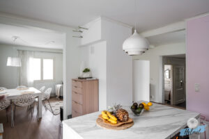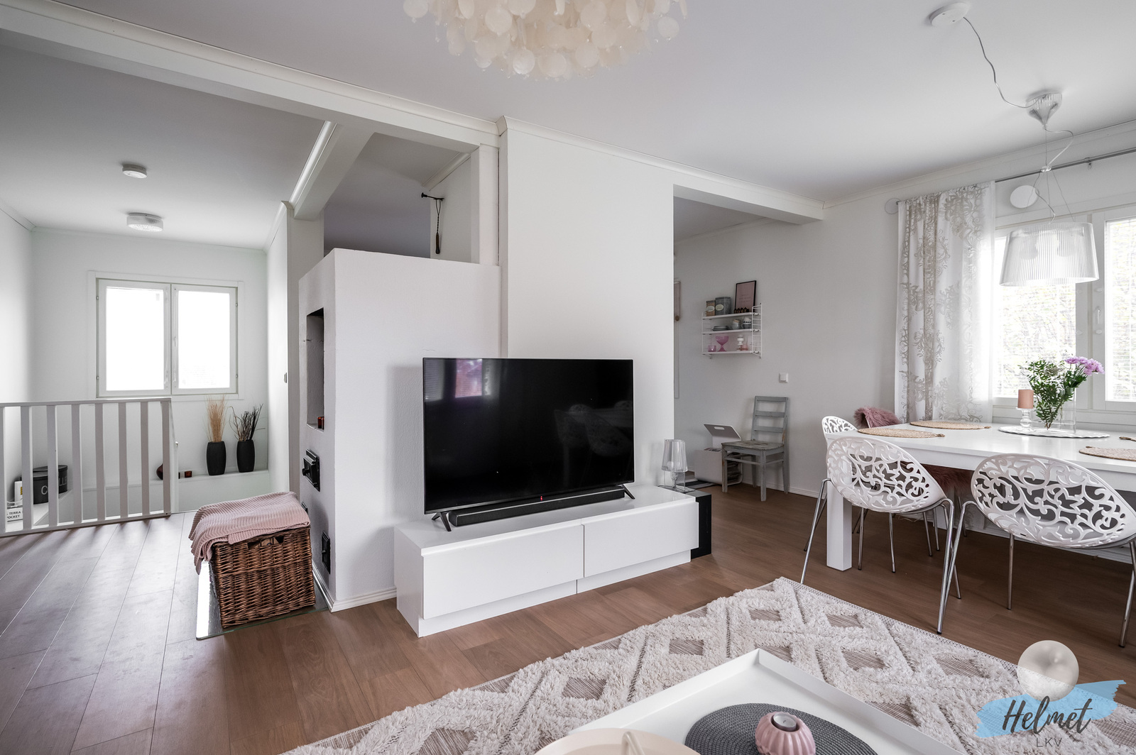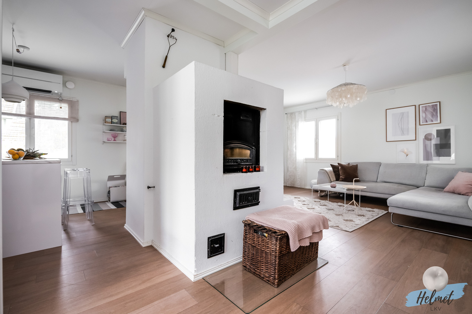 Keittiö uusittu ja avarrettu olohuoneeseen 2018. Tämä remontti on tehty ”pintaa syvemmälle”.