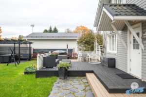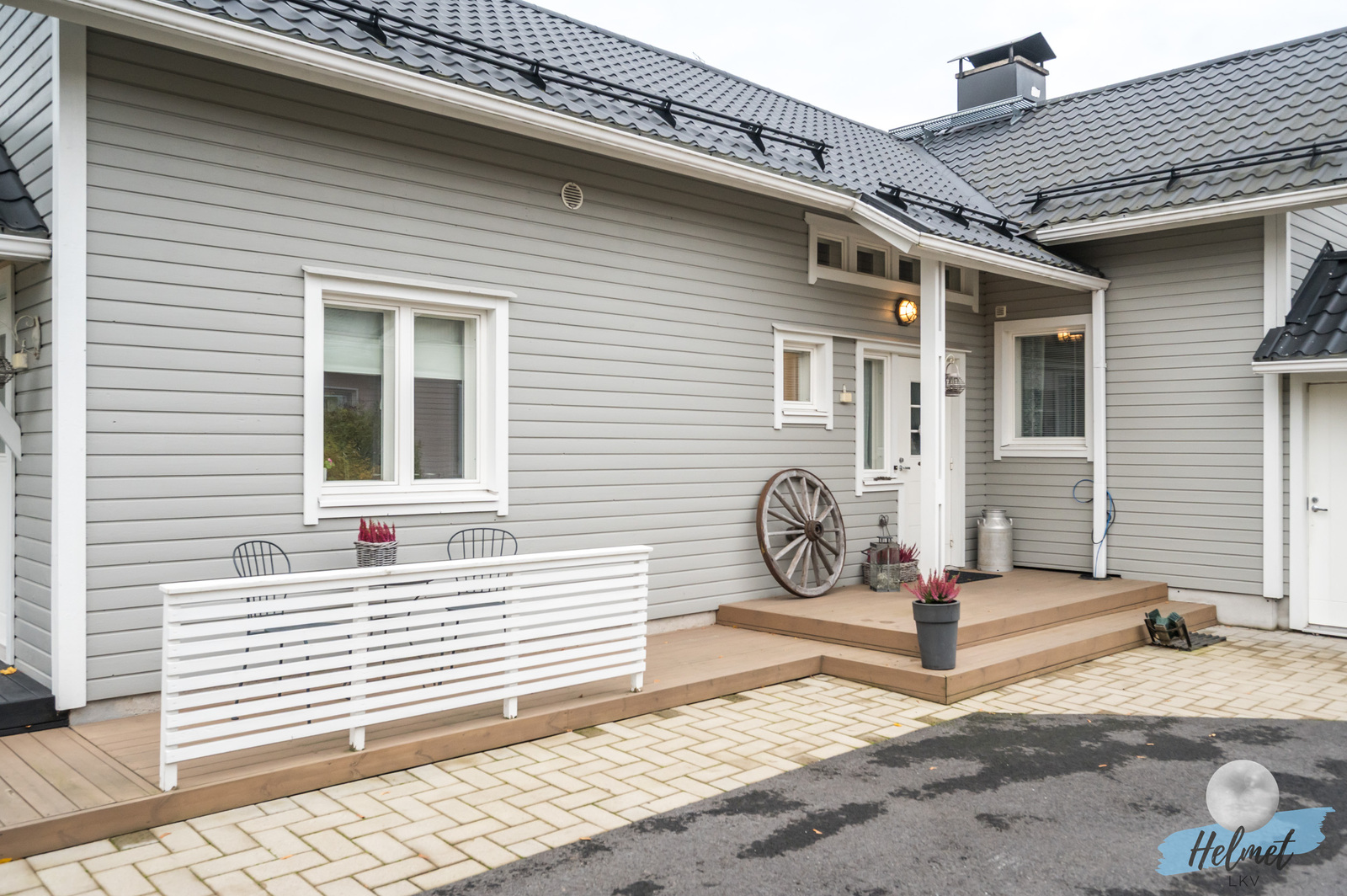 Iso terassi kiertää kahdelta puolelta taloa ja sitä ympäröi hyvin hoidettu piha-alue.