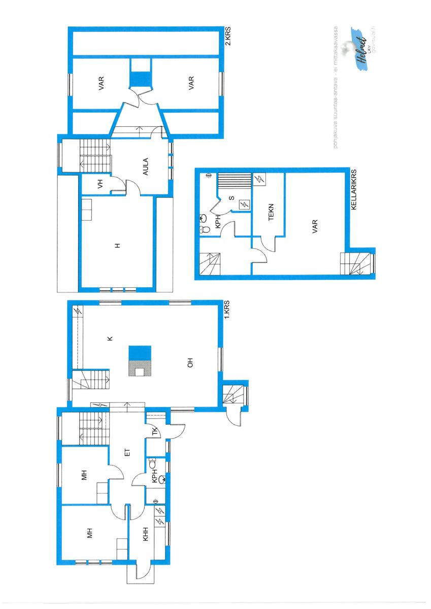 Huoneistoselitelmä | 3mh, oh, k, ph, khh, wc, viihdehuone, s, ph, aula, mh. |